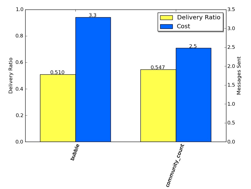 Unfortunately, or fortunately, depending on how you look at it, it is not a bug in the code. It was because of a decision we made a long while back, to force each community finding algorithm to output a top level community including all nodes. This works well for BubbleH, which uses targeted community routing. But, and in hindsight, this is obvious, BUBBLERap simply looks as community membership, and so, when it meets another node, they are ALWAYS in the same community, and therefore it routes using ONLY local ranking. This has the effect of making our implementation simply centrality based routing.