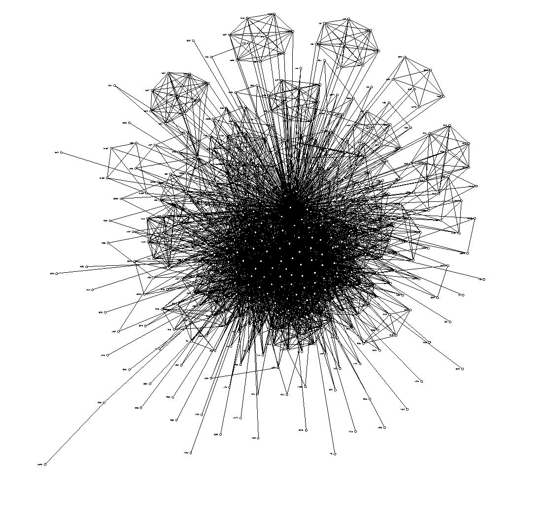Below is a visualisation of the connected cell towers for MIT-Oct 2004, it it very confused and has a huge central mass, but there are clear connections of towers on the periphery. I think this can be further refined to be more strict about cell tower connections (as at the moment, the dataset contains more than 1 cell tower for any given contact period). Also, at the moment it links two cells even when two nodes are on contact for a long period of time, in which they could conceivably be moving together.