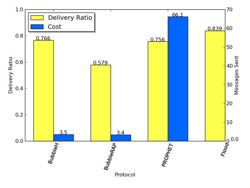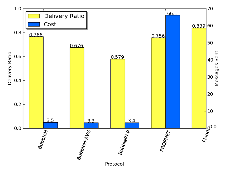 This is a positive result, but whilst doing some work towards the next paper for NGMAST11, I realised that we should be doing runs for multiple parameters to K-Clique, however for this paper, probably don’t need to worry so much. Also, for reference, the average value for BubbleH is included in the plot below.