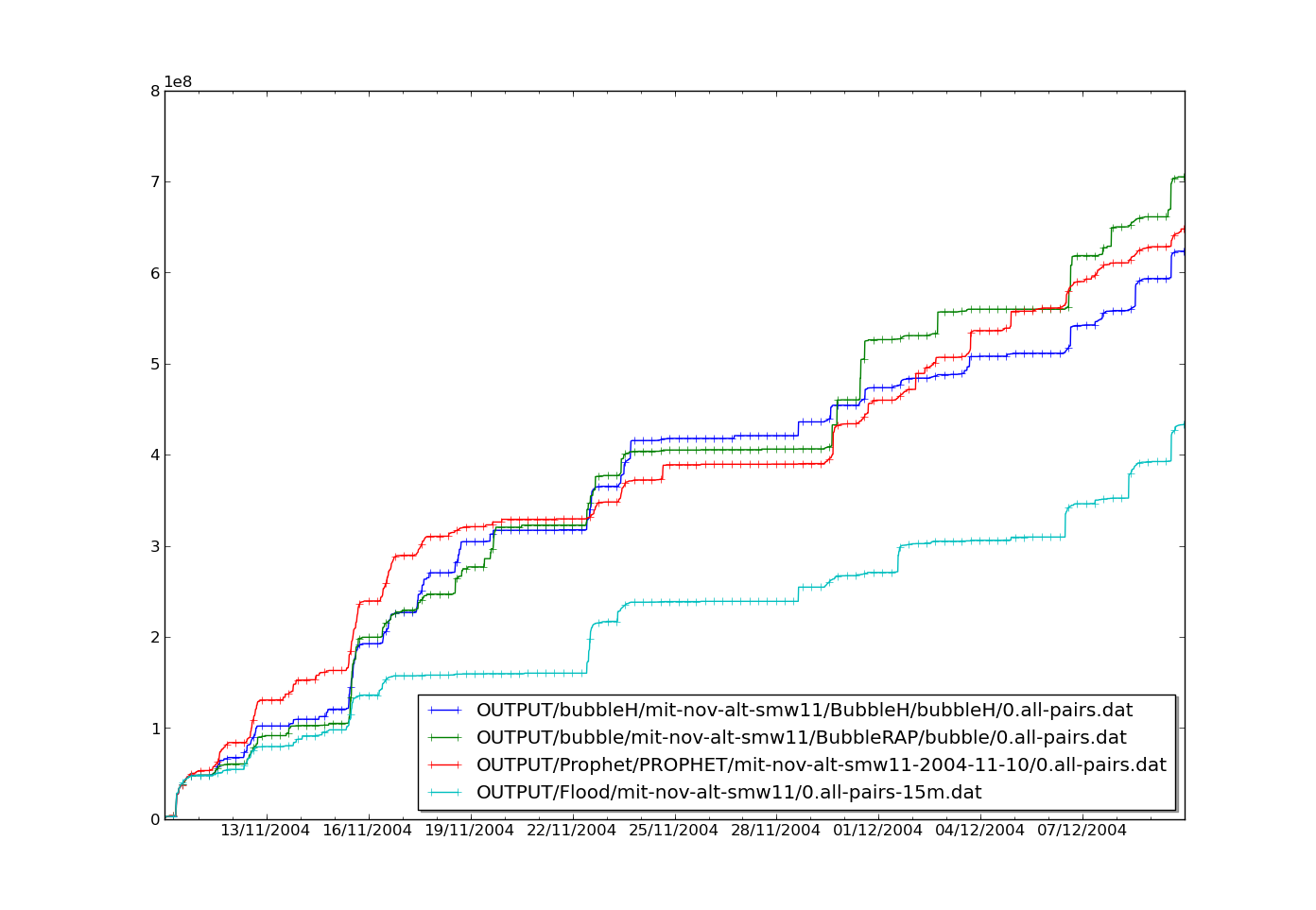 In the last few days, I have been trying out new CFAs for use in the next paper for NGMAST11, the idea behind the paper is exploring different CFAs and datasets and seeing what happens. In order to do this, I have decided to first explore what the Different CFAs do using the MIT-NOV dataset, for both BubbleRAP and BubbleH, i.e. use the communities found by each to drive both DTN algorithm. This gives a fair comparison. Then, I will perform the same tests on different datasets, I envisage problems for some CFAs as the datasets we intend to use are in some cases small, and may not yield good community results, and therefore we will explore thresholding of edges before finding communities (depending on whether the CFA can accept weighted edges or not.