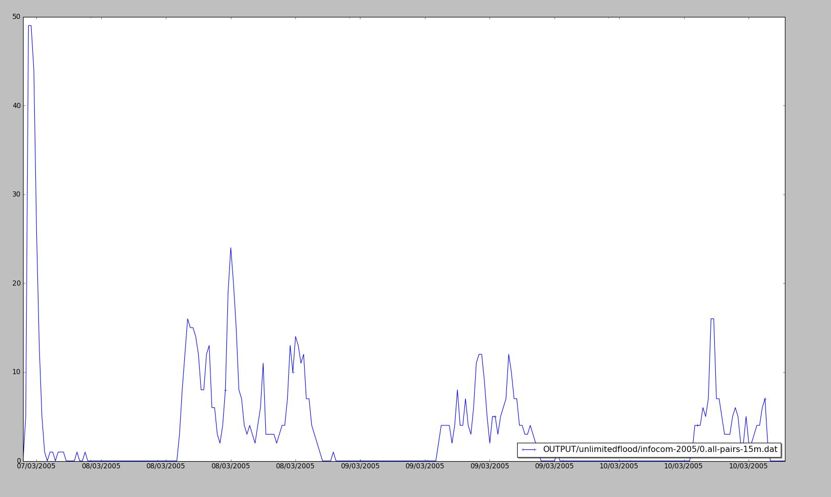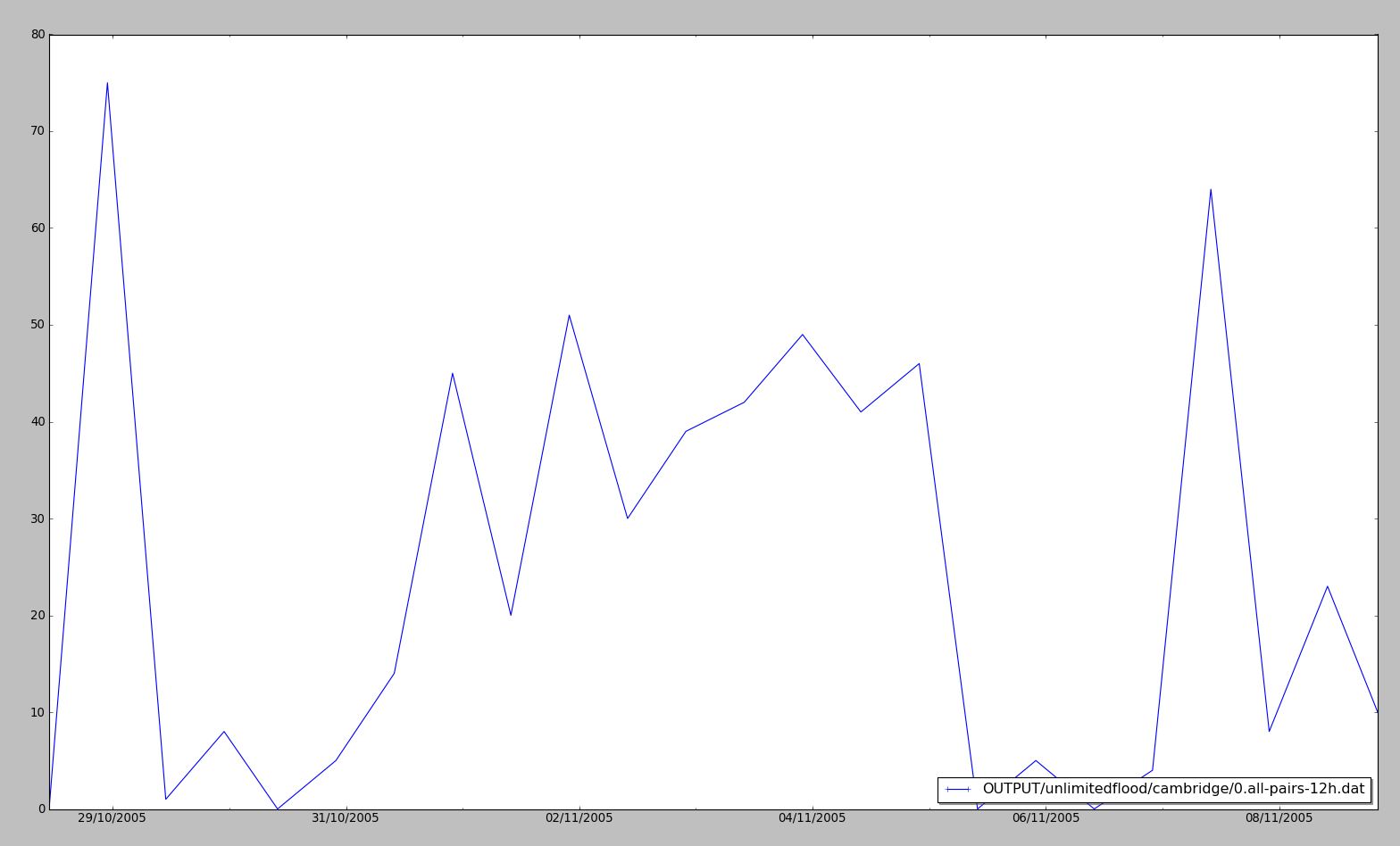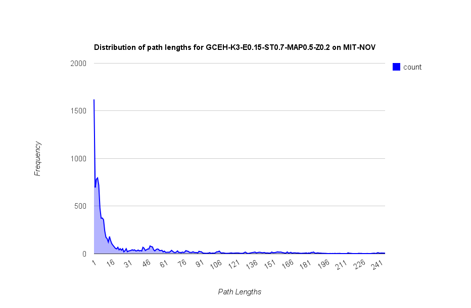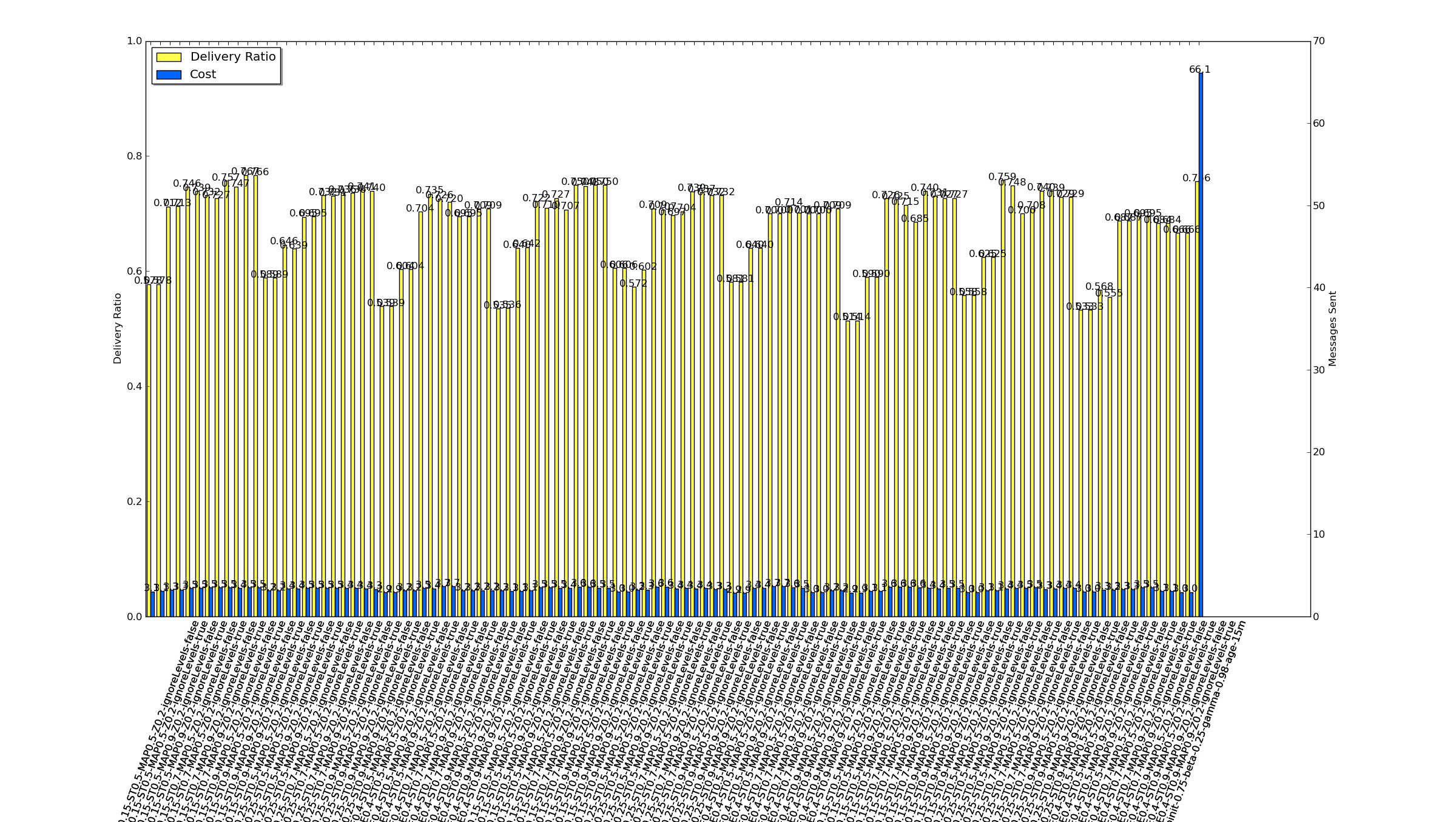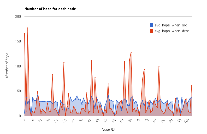 In the recent paper that we submitted to SMW2011, we showed that we could increase the delivery ratio using overlapping hierarchical clustering, however, we also identified that the cost involved was much higher than we expected, up to 245 hops in some cases.  To find out what was happening, we checked the behaviour of the best performing parameters (GCEH-K3-E0.15-ST0.7-MAP0.5-Z0.2) by recording the route of each message along with some hints as to why the message was being passed at that point. Hop Stats for GCEH-K3-E0.15-ST0.7-MAP0.5-Z0.2 (11MB uncompressed).