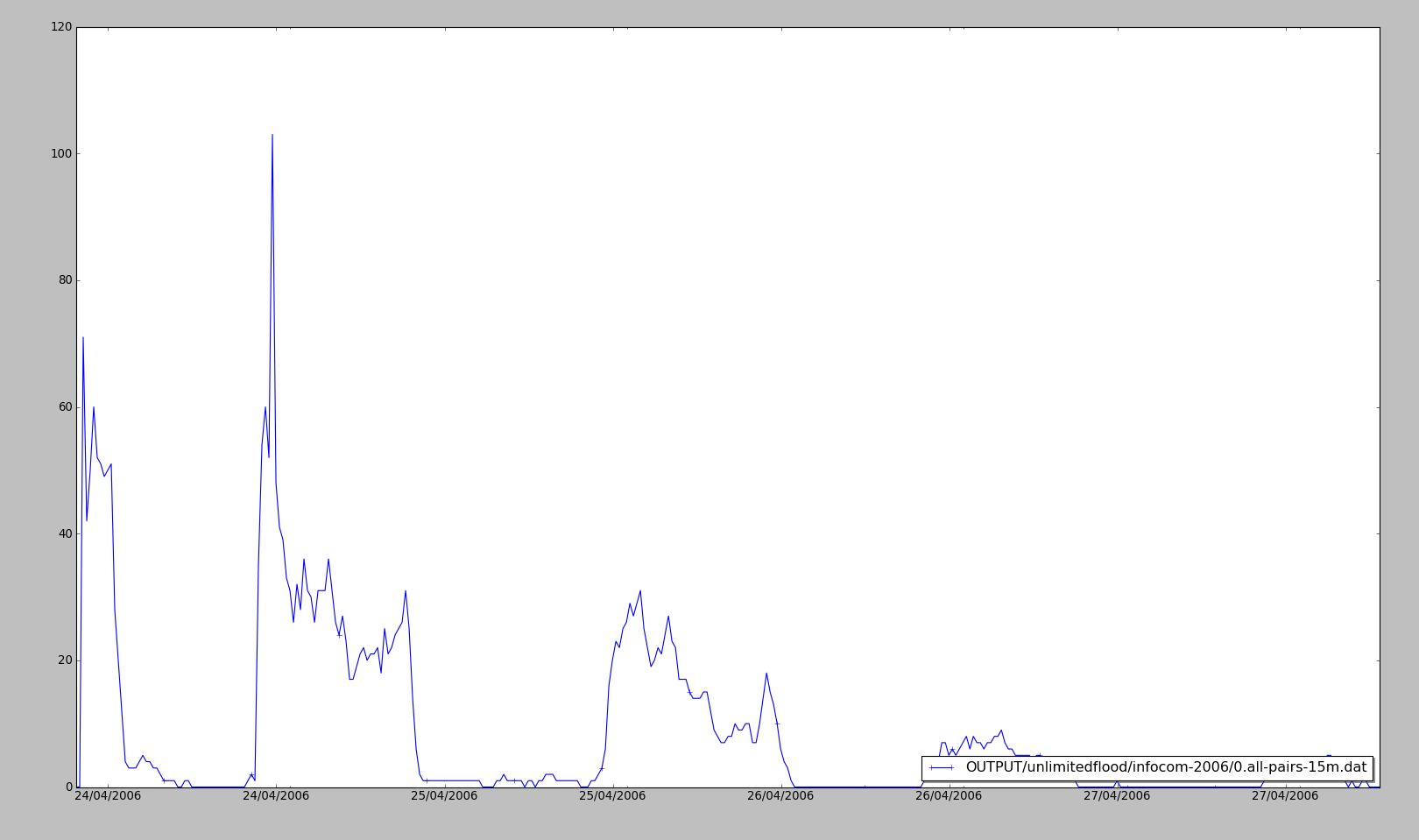 InfoCom 2006 edges removed where connected time less than 4 hours – (min = 1000ms max = 72 hours). InfoCom2006 gephi file.