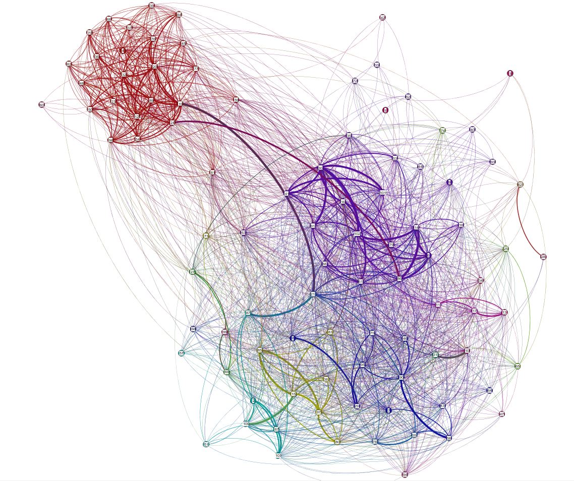 InfoMap clustering of MIT-NOV dataset - Colour of nodes indicates clustering (edges are coloured by connecting node and weighted by connected time)