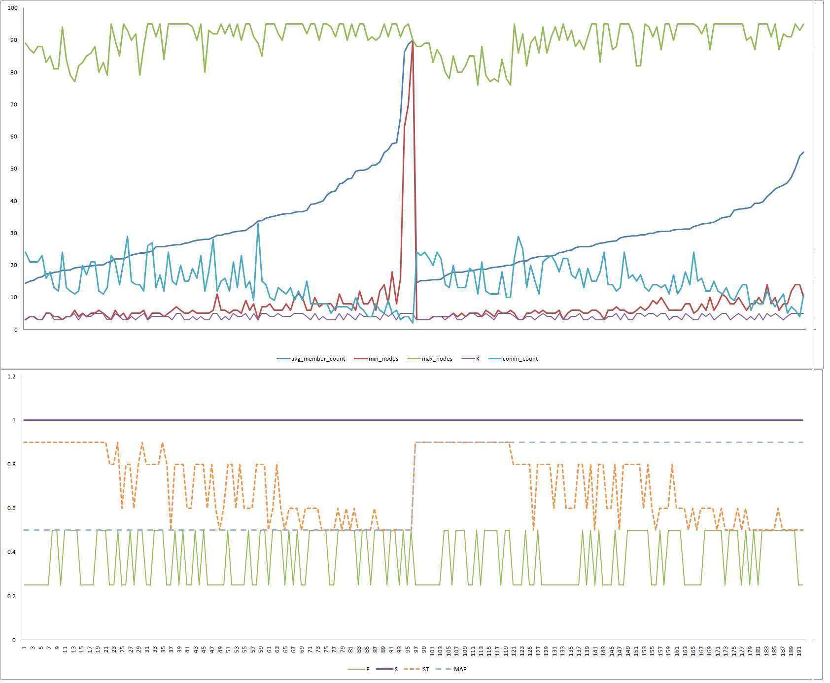The communities found by HGCE are multiplied across many parameters to the algorithm, so they are much harder to visualise in terms of nodes and edges, however, the plot below, shows the effect on community size and number of communities when changing parameters to HGCE. The graph below is orderded by MAP, ST and average nodes per community. Details about the parameters to HGCE are summarised here.