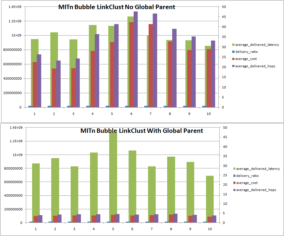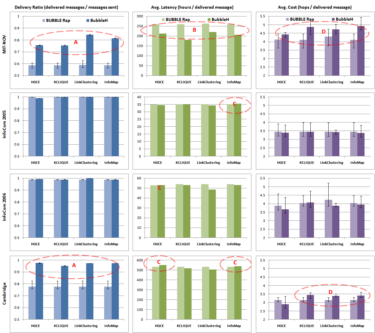 The new results shows a slightly different picture, in that the improvement in delivery ratio and latency are less pronounced. One interesting thing is that for InfoMap, which partitions the graph, the results are exactly the same. This is because there is no ovelap, which both algorithms to work in the same way, i.e. BUBBLERap uses global centrality to route between nodes of different communities, and BubbleH uses the local centrality in the GLOBAL parent to route to nodes not in smaller communities. This means that BubbleH is actually designed solely for overlapping community structure. With regards to the Heirarchichal clustering of HGCE, we see that it performs poorly for Cambridge, but roughly equally for the others. LinkClustering for BUBBLERap in InfoCom2005 and MIT-NOV performs very poorly on Delivered Hops. This could be down it creating a large number of communities.